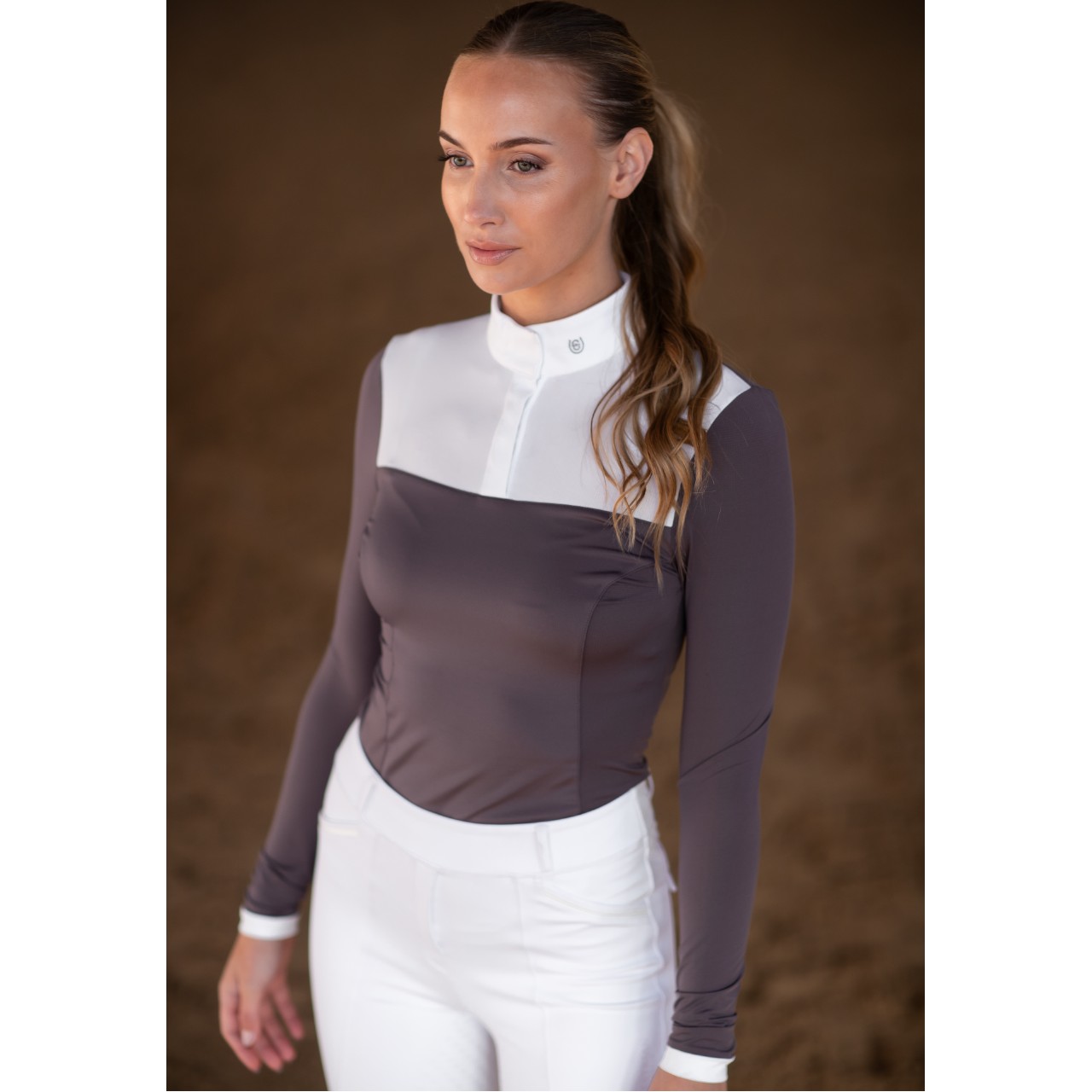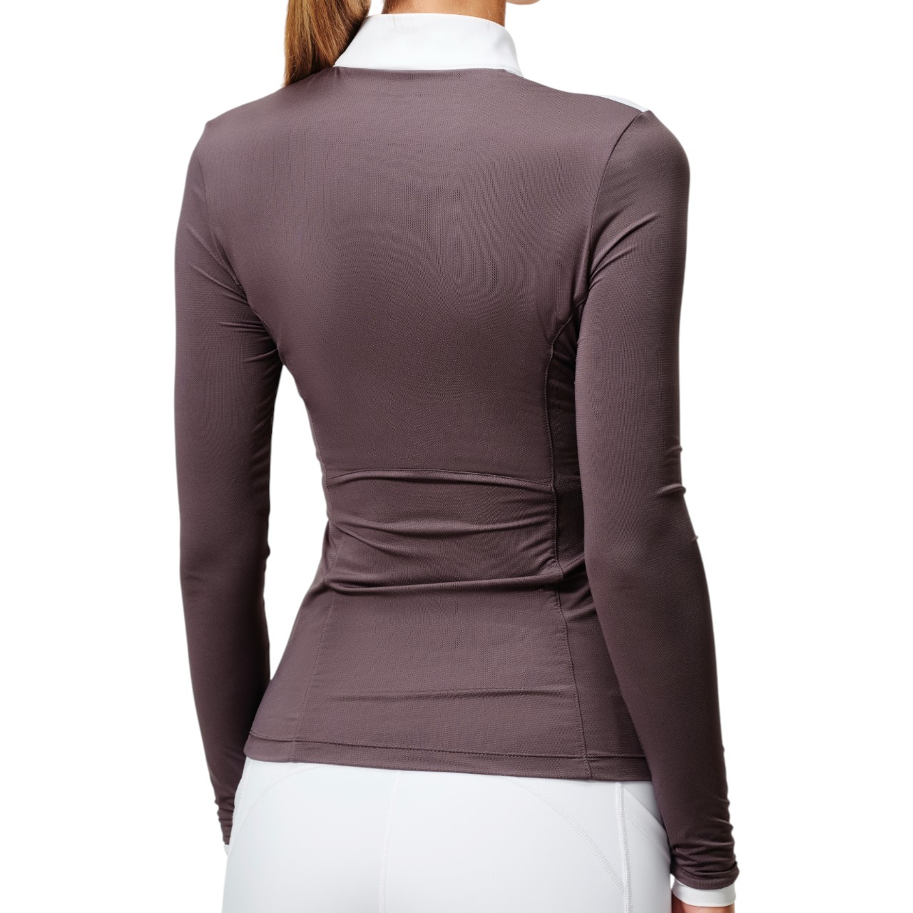 Equestrian Stockholm präsentiert mit dem Turniershirt Damen Langarm Fine Line White Dark Violet Longsleeve ein stilvolles Competition Shirt, das durch clevere Funktionalität und sportlich-elegantes Design überzeugt. Der atmungsaktive Materialmix mit Mesh-Zonen sorgt für höchsten Tragekomfort – selbst bei anspruchsvollen Turniereinsätzen.