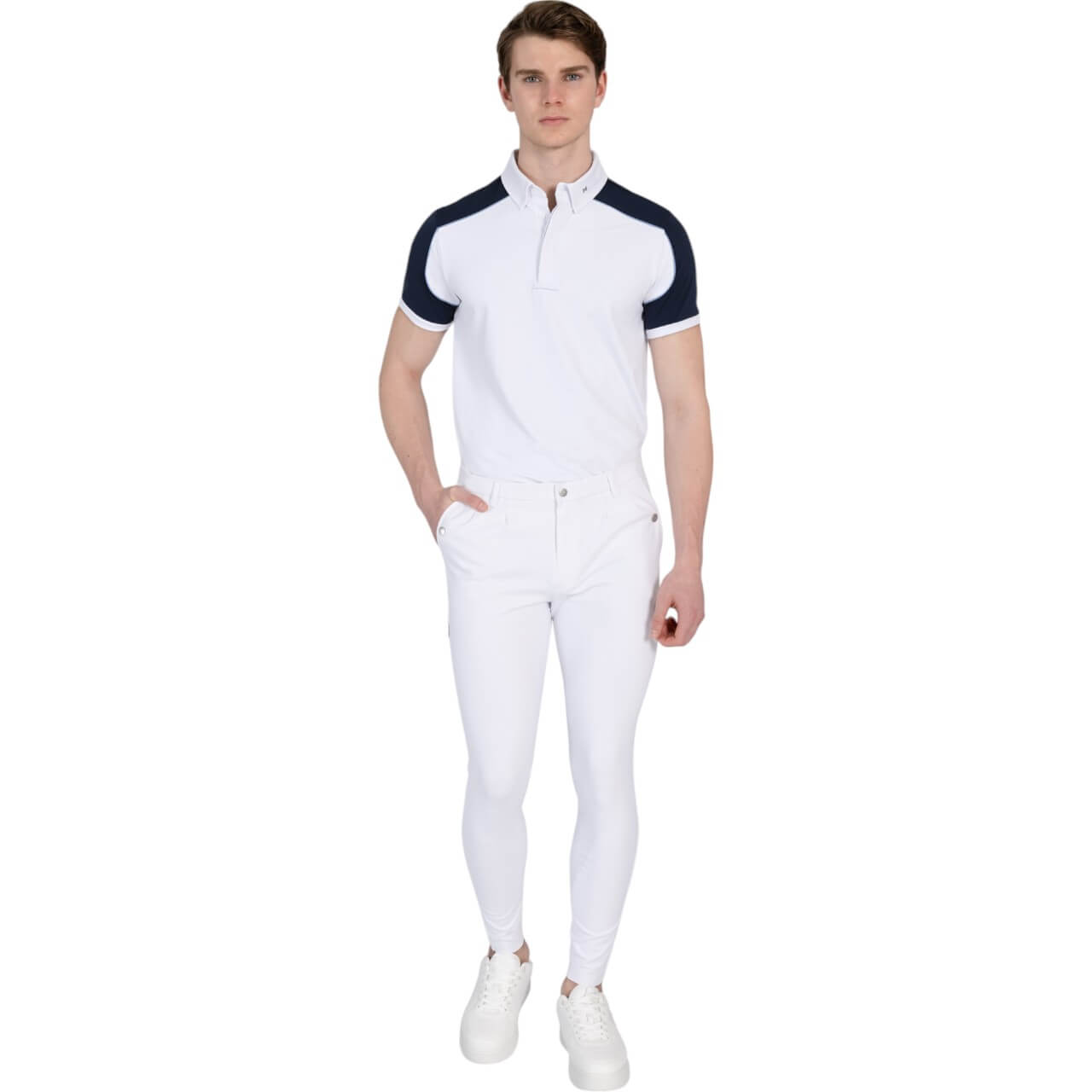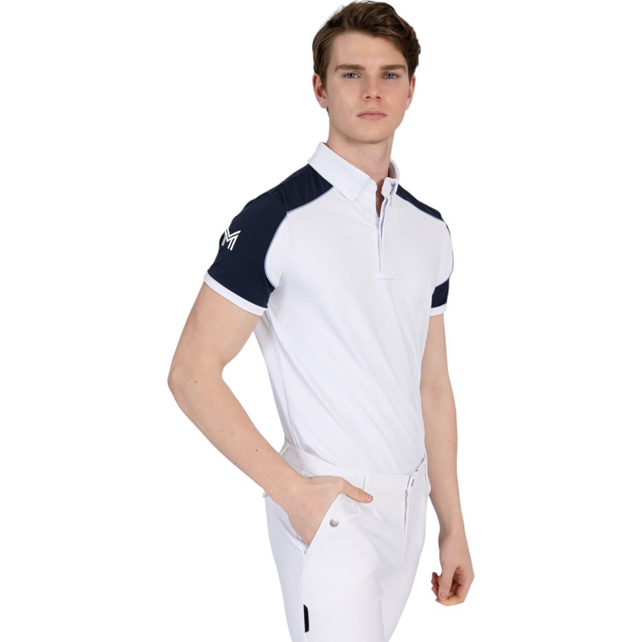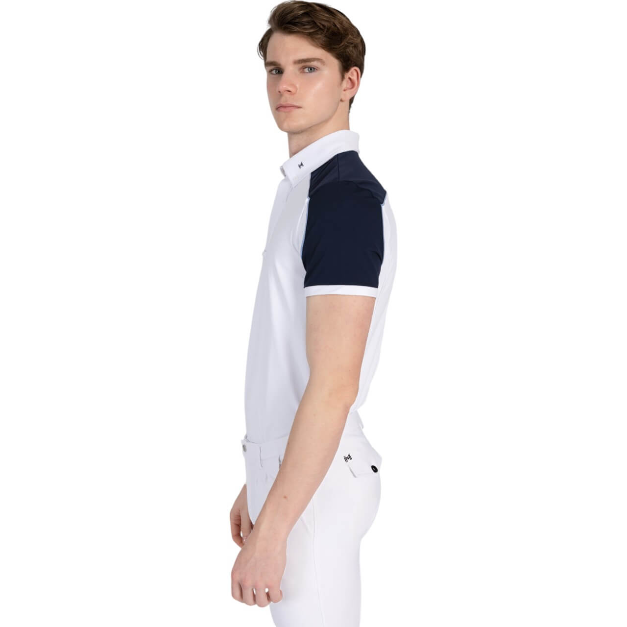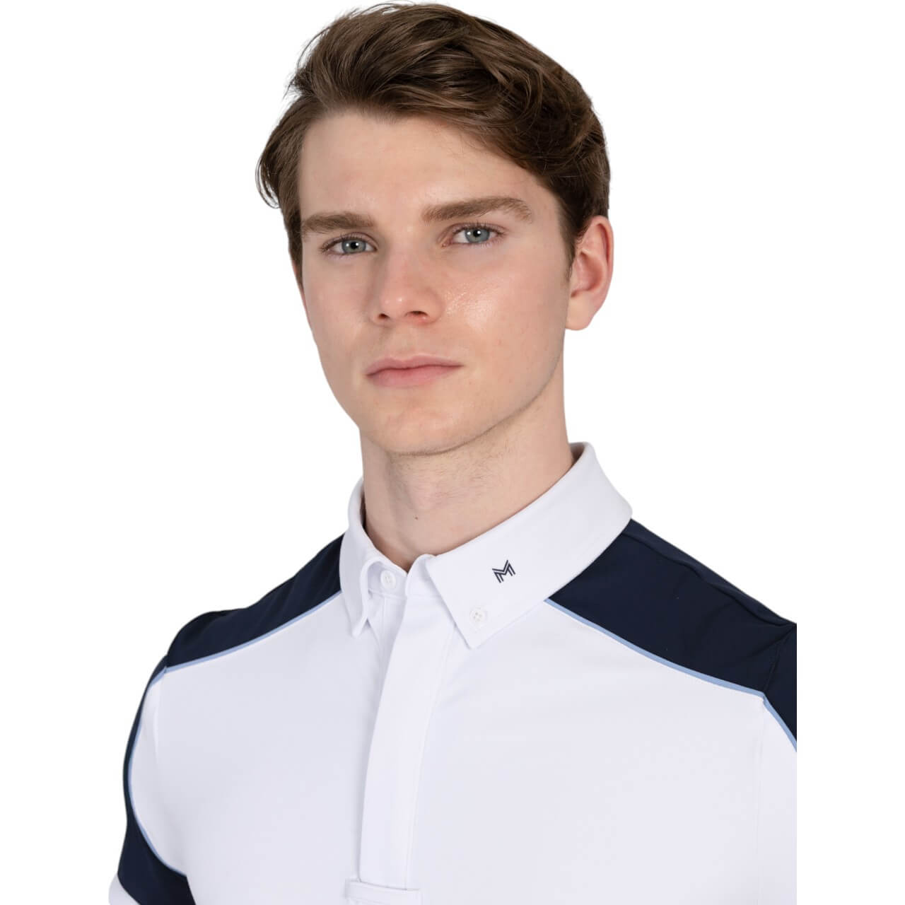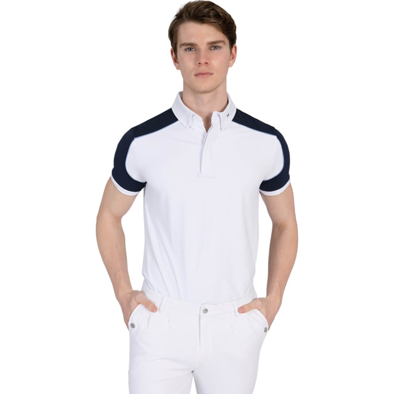 Mit seinen eleganten Kontrasteinsätzen in Navy und der dezenten, hellblauen Paspelierung setzt das Shirt modische Akzente. Die durchdachten Details, wie der Button-Down-Kragen mit Krawattenhalter, verleihen einen professionellen Look. Die Kombination aus Funktion und Stil macht es zu einem Must-have für anspruchsvolle Reiter.