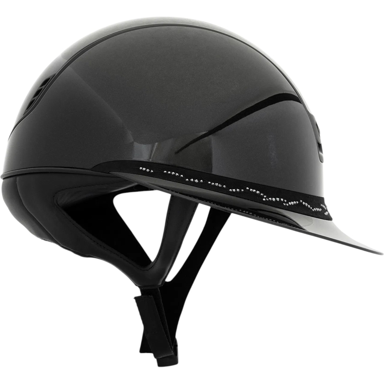 Der Reithelm Miss Shield 2.0 besticht durch seine zeitlose Ästhetik in schwarzer Optik. Die Kombination aus Shadowglossy und Tiara Black Graphite verleiht dem Helm einen edlen Glanz. Dieses Design sorgt nicht nur für einen stilvollen Auftritt, sondern bietet auch optimalen Schutz.