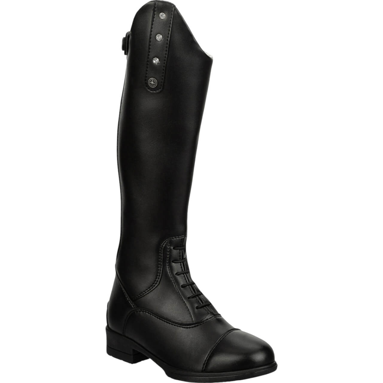 Mit den Reitstiefel Kids Fun Glitter Winter stiehlst du auf jedem Reitplatz die Show. Die eleganten Strasssteine verleihen den Stiefeln einen glamourösen Look, der jedes Outfit aufwertet. Der schwarze Lederimitat sorgt für ein klassisches Erscheinungsbild, während die Derbyschnürung und der hintere Reißverschluss ein einfaches An- und Ausziehen ermöglichen.