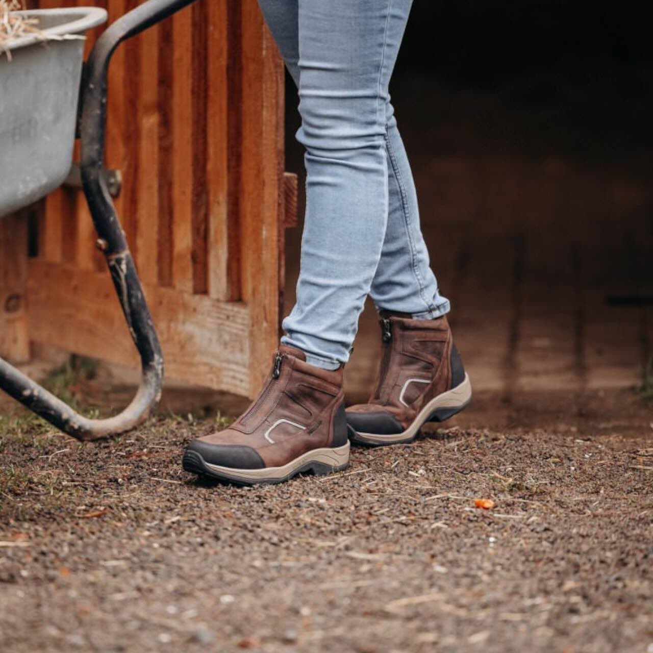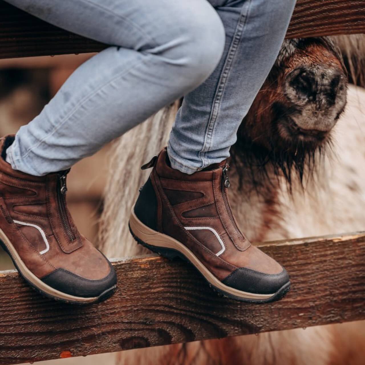 Die von Suedwind entwickelte GripFTX Sohlentechnologie bietet ein flexibles Traktionsprofil für besten Halt auf verschiedenen Untergründen. Ob rutschiger Hof, matschige Paddocks oder glatte Stallgassen – mit dieser Sohle bleibst du standfest. Für den nötigen Tragekomfort sorgt die integrierte OrthoLite®-Innensohle, die sich durch ihre langlebige Dämpfung und gute Rückfederung auszeichnet. Auch nach einem langen Tag im Stall spürst du die bequeme Polsterung bei jedem Schritt. Durch den Front-Zipper lässt sich die Stiefelette schnell an- und ausziehen, ohne an Stabilität zu verlieren. So wird sie zum praktischen Alltagsbegleiter für ambitionierte Reiter.