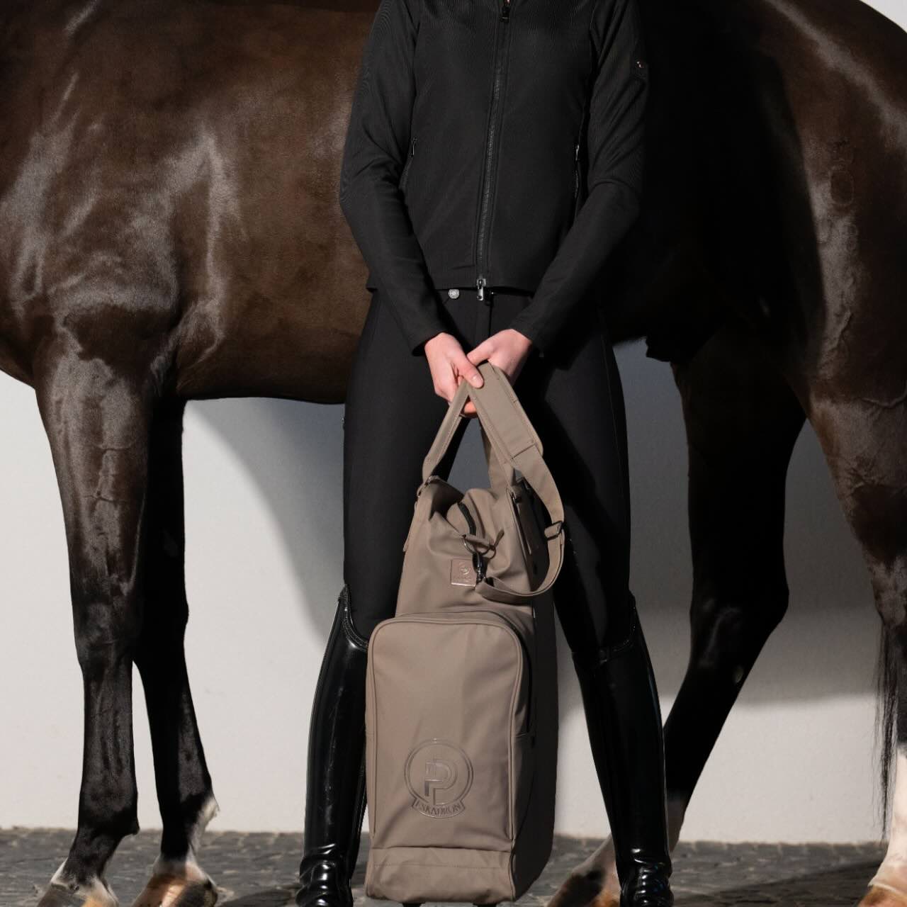Die Tasche überzeugt mit einem eleganten Erscheinungsbild und edlen Details. Das taupefarbene Finish und das markante Platinum-Emblem sorgen für eine hochwertige Optik. Die glänzenden Metallbeschläge ergänzen das edle Design und unterstreichen den Premium-Charakter der Tasche. Trotz ihrer Eleganz bleibt sie durch das pflegeleichte Material praktisch im Alltag. Besonders bei Turnieren oder im Stallalltag punktet sie mit ihrer stilvollen Präsenz. Die Optik fügt sich nahtlos in die Platinum 2025-Kollektion ein.