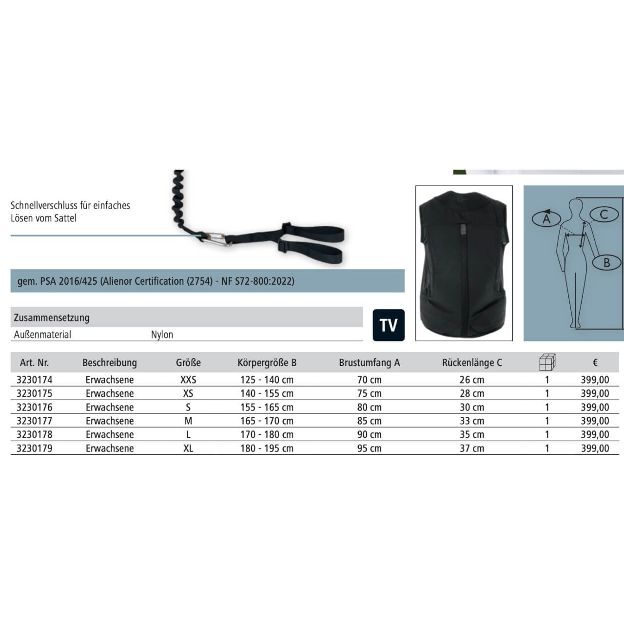 Mit ihrem leichten Design und der flexiblen Passform trägt sich die Airbag-Weste Manege besonders angenehm. Sie ist in sechs verschiedenen Größen erhältlich und passt sich optimal deinem Körper an. Dank der durchdachten Konstruktion kannst du sie mühelos über deiner normalen Kleidung oder sogar über anderen Schutzwesten tragen, ohne dass deine Bewegungsfreiheit eingeschränkt wird.