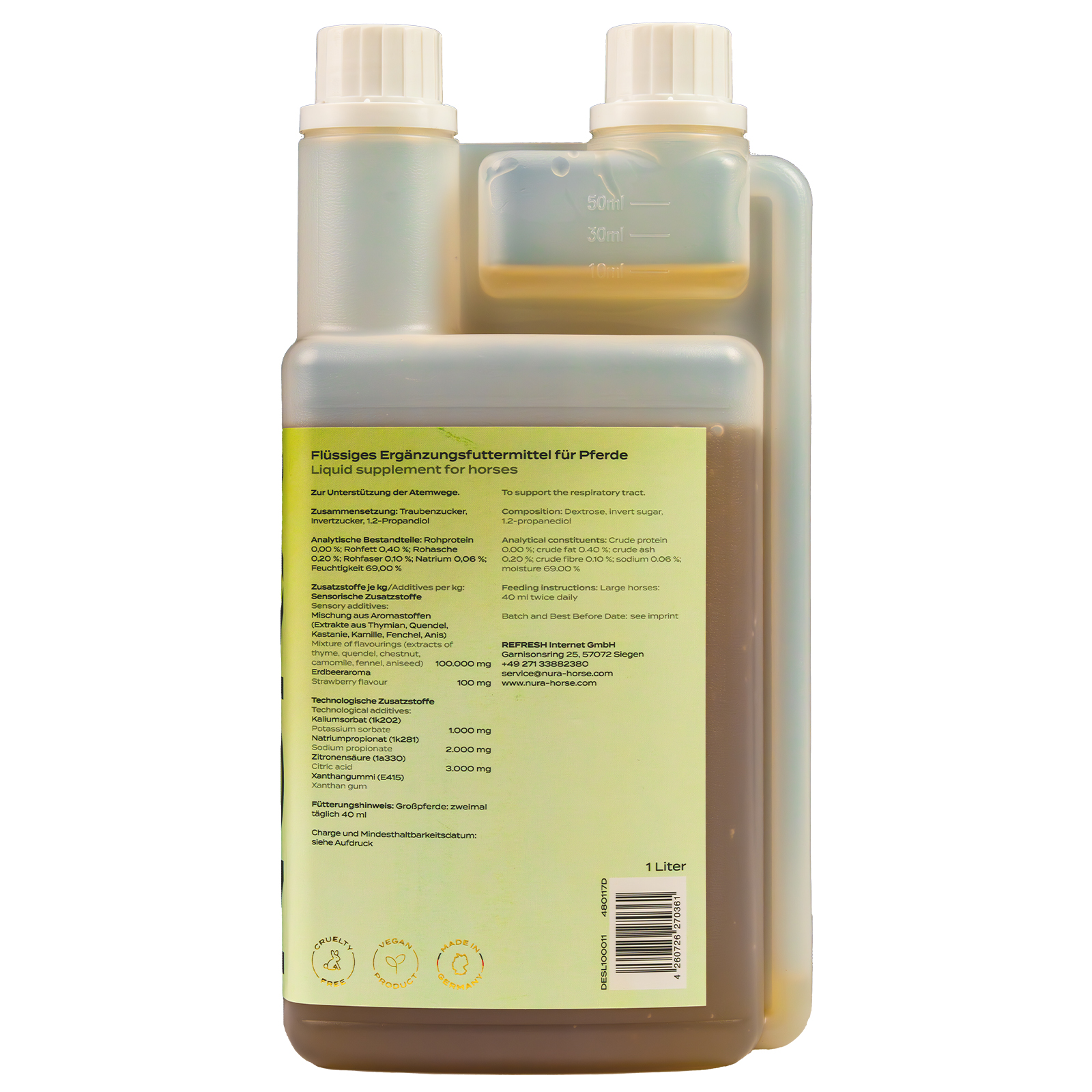 Das flüssige Ergänzungsfuttermittel Nura Frischluft Zusatzfutter Ergänzungsfuttermittel von Nura Horse Supplements kann dein Pferd gezielt bei der Aufrechterhaltung gesunder Atemwege unterstützen. Die vegane, tierversuchsfreie Rezeptur mit Erdbeeraroma kombiniert hohe Akzeptanz mit verantwortungsbewusster Herstellung in Deutschland.