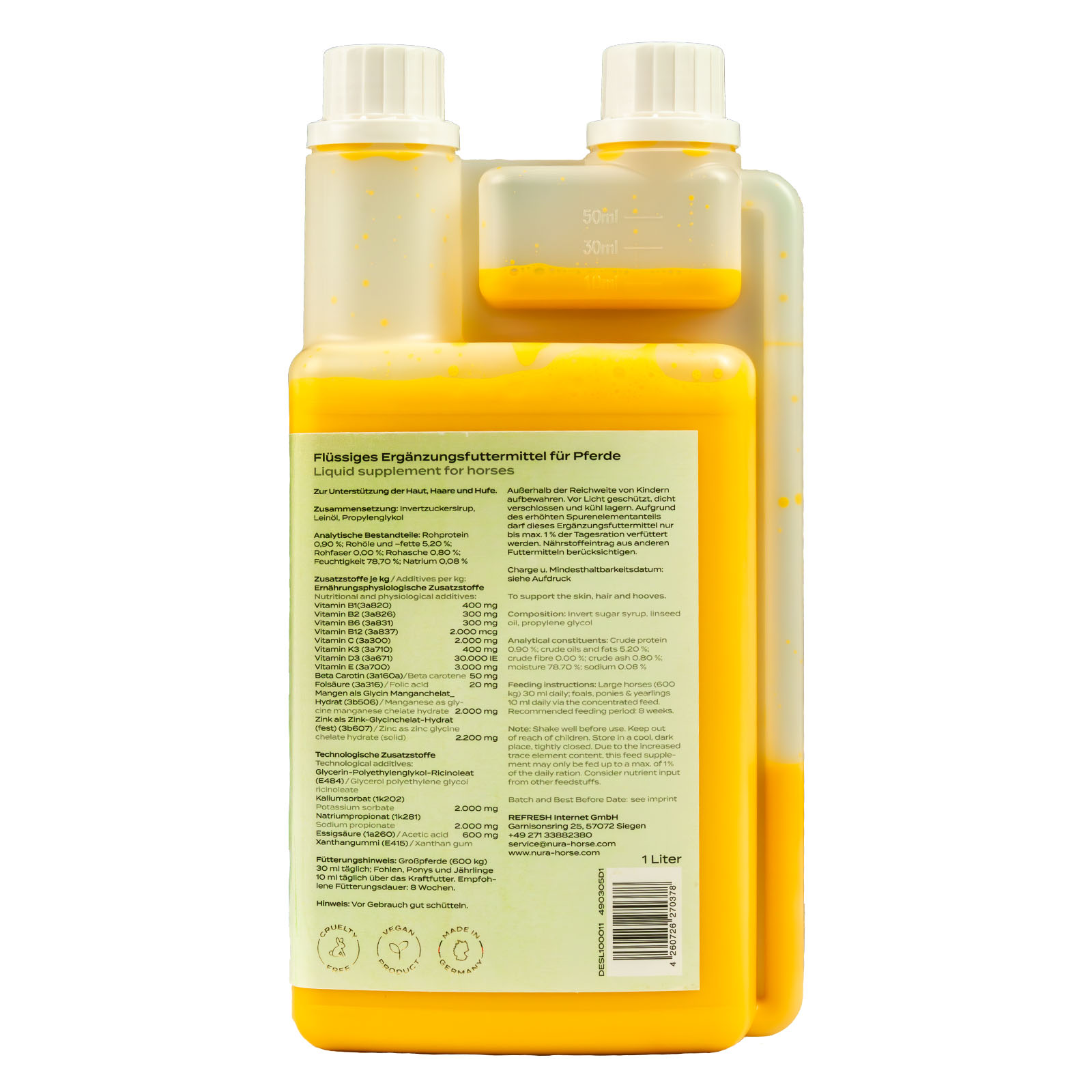 | Besonderheiten | Für Haut, Fell, Hufe, gut dosierbar, Made in Germany, Tierversuchsfrei, Vegan |