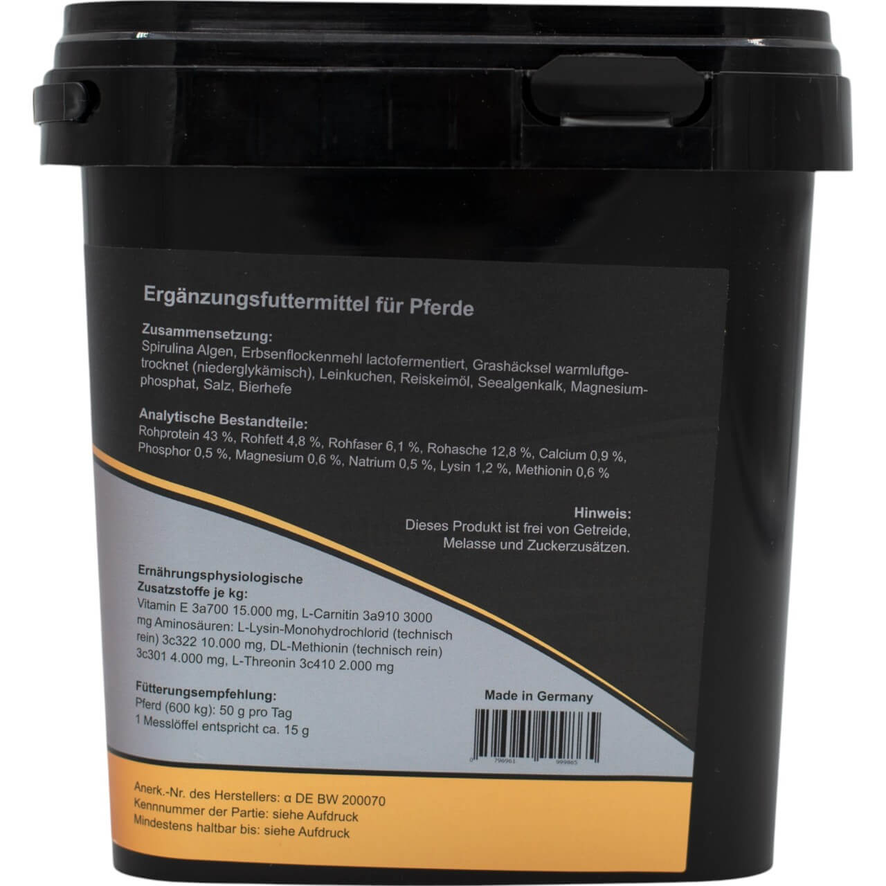 | Fütterungsempfehlung | 50g pro Tag (Pferd 600kg) |