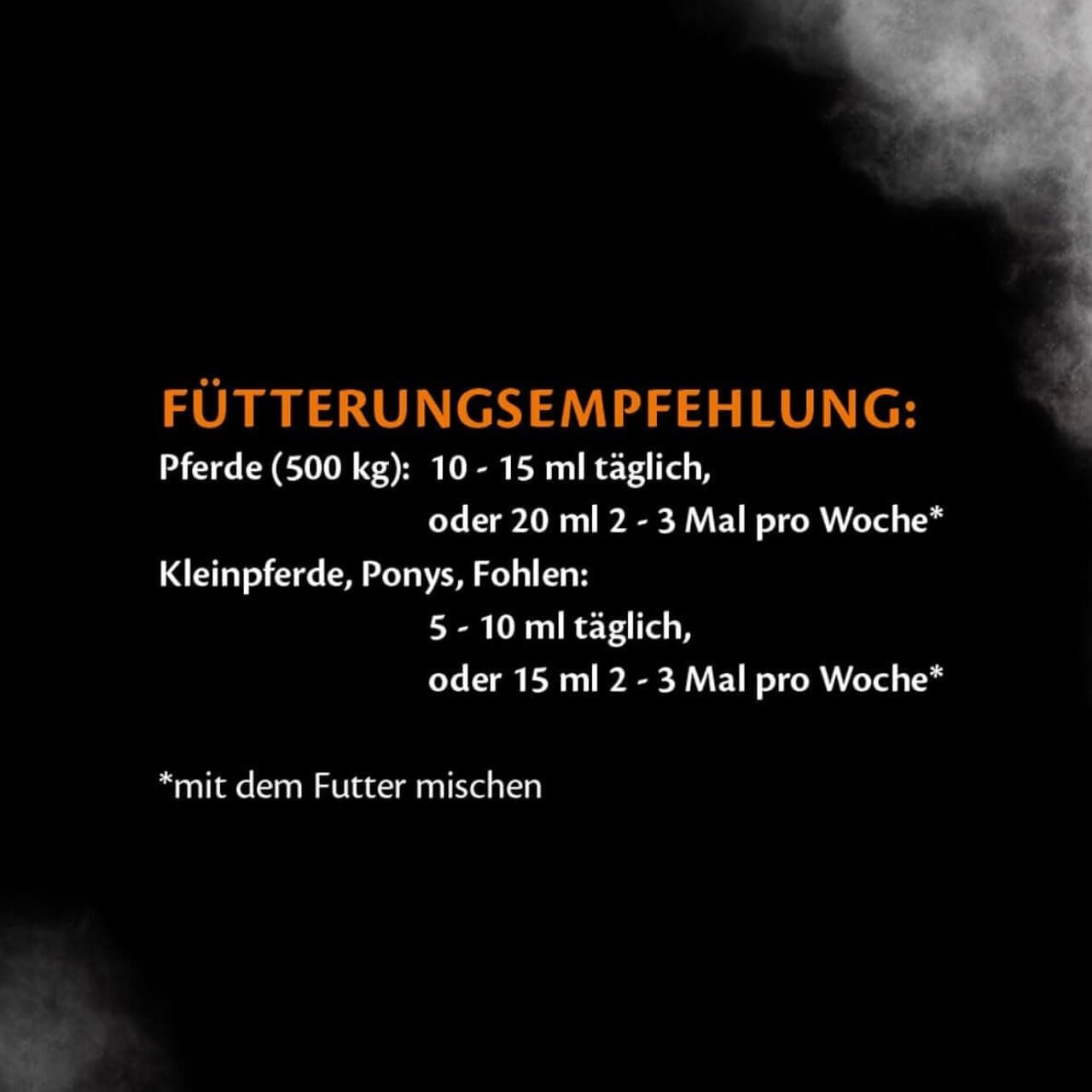 | Fütterungsempfehlung | nicht über 120 ml/Pferd (500 kg KGW)/Tag verabreichen |