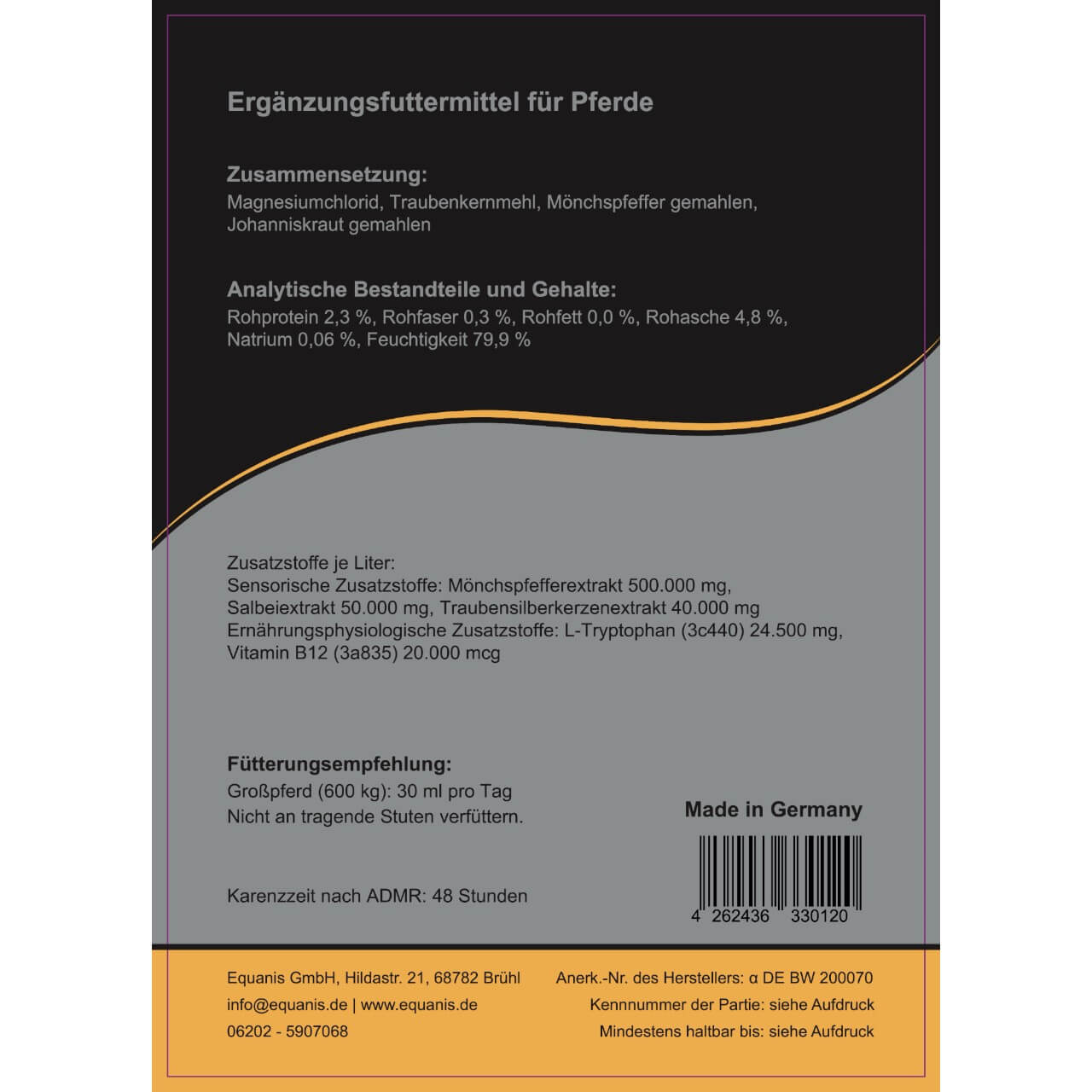 | Fütterungsempfehlung | 30 ml pro Tag (Pferd 600kg), nicht bei tragenden Stuten füttern |