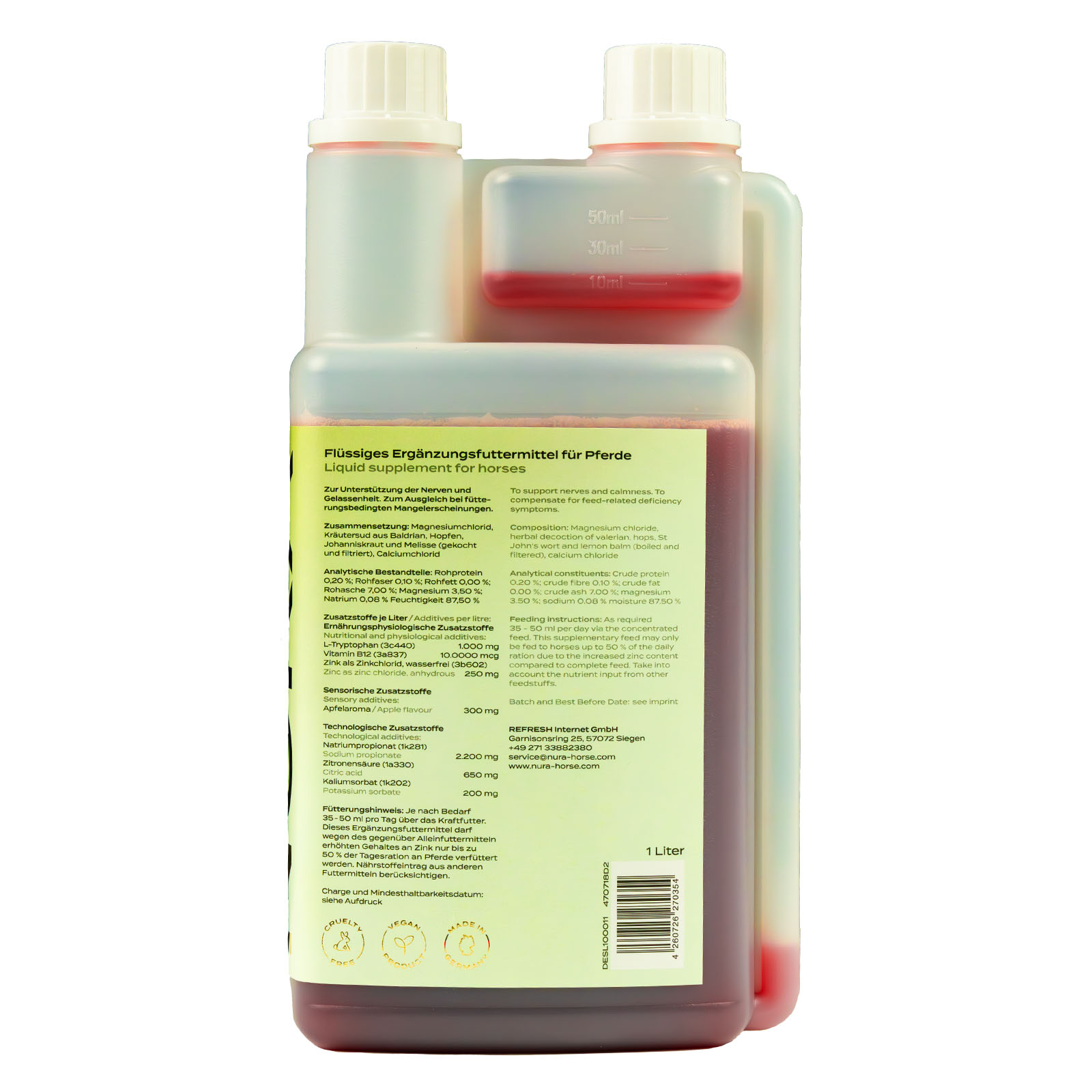 Die empfohlene Tagesdosis liegt bei 35–50 ml, abhängig vom individuellen Bedarf. Die Gabe erfolgt unkompliziert über das Kraftfutter und kann problemlos in bestehende Fütterungsroutinen integriert werden. Aufgrund des erhöhten Zinkgehalts sollte Nura Kopfklar maximal 50 % der täglichen Ergänzungsration ausmachen. Das Produkt wird in Deutschland unter kontrollierten Bedingungen hergestellt – für gleichbleibende Qualität. Die vegane, tierversuchsfreie Rezeptur steht für eine verantwortungsbewusste und nachhaltige Fütterung. So unterstützt du nicht nur dein Pferd, sondern trägst auch zu einem bewussten Umgang mit Ressourcen bei.