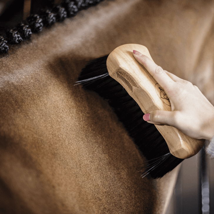 Die lackierte Oberfläche der Pferdbürste verleiht ihr nicht nur ein ansprechendes Aussehen, sondern schützt auch vor Feuchtigkeit. Die langen, braunen Borsten sind nicht nur optisch ansprechend, sondern auch funktional gestaltet, um selbst tiefsitzenden Schmutz effektiv zu entfernen. Die glatten Borsten im Zentrum der Bürste sorgen für einen zusätzlichen Reinigungseffekt und machen sie zu einem unverzichtbaren Werkzeug im Stall.