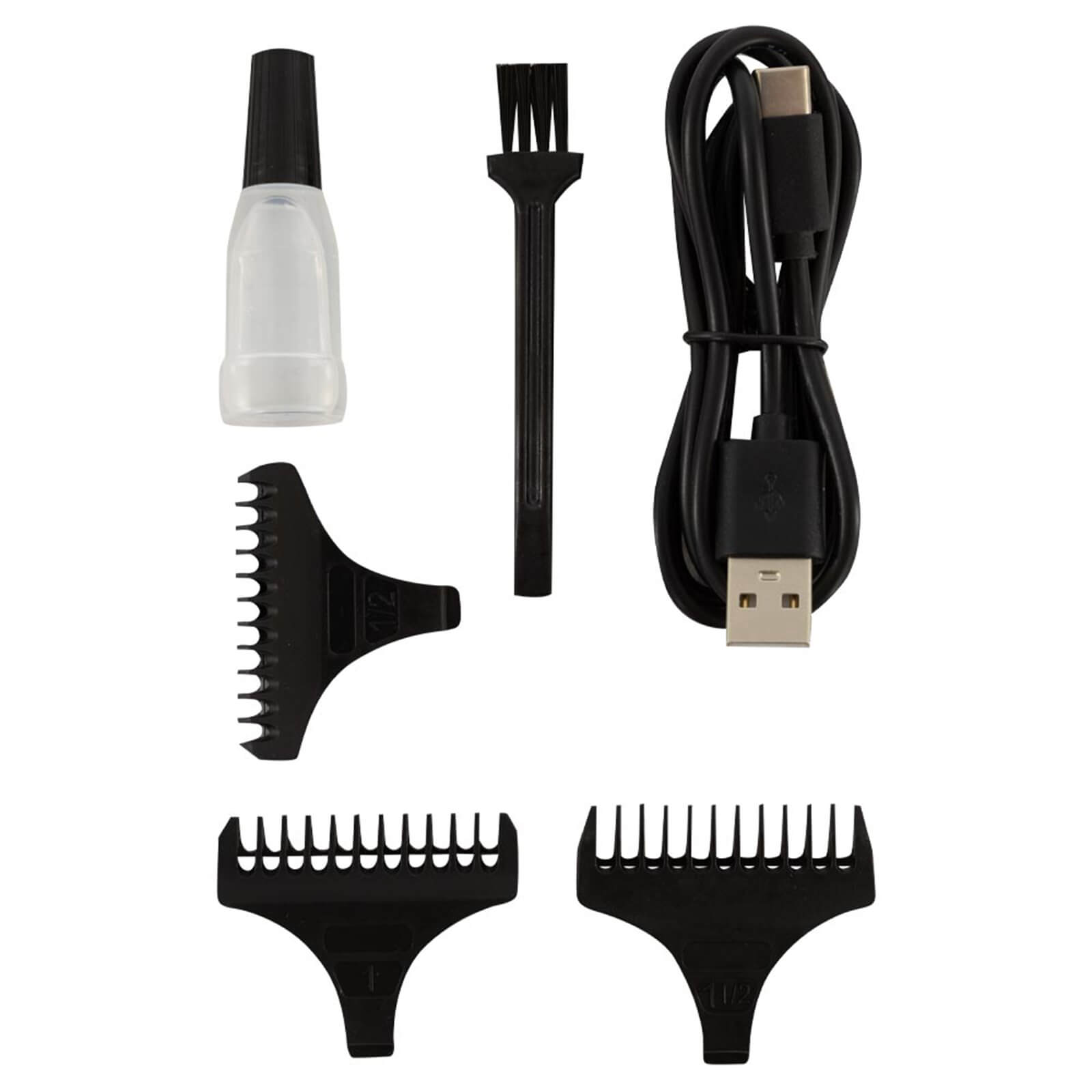 | Lieferumfang | 3 x Abstandshalter (0,5mm, 1mm, 1,5mm), Reinigungsbürste, Scherkopf, USB-Ladekabel, Öl |