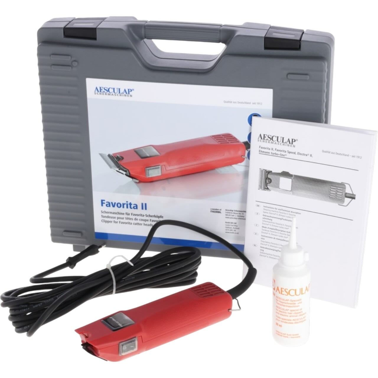 | Lieferumfang | 1 x Aesculap Öl, 1 x Bedienungsanleitung, 1 x Hartschalenkoffer, 1 x Schermaschine Favorita II, Lieferung ohne Scherkopf |