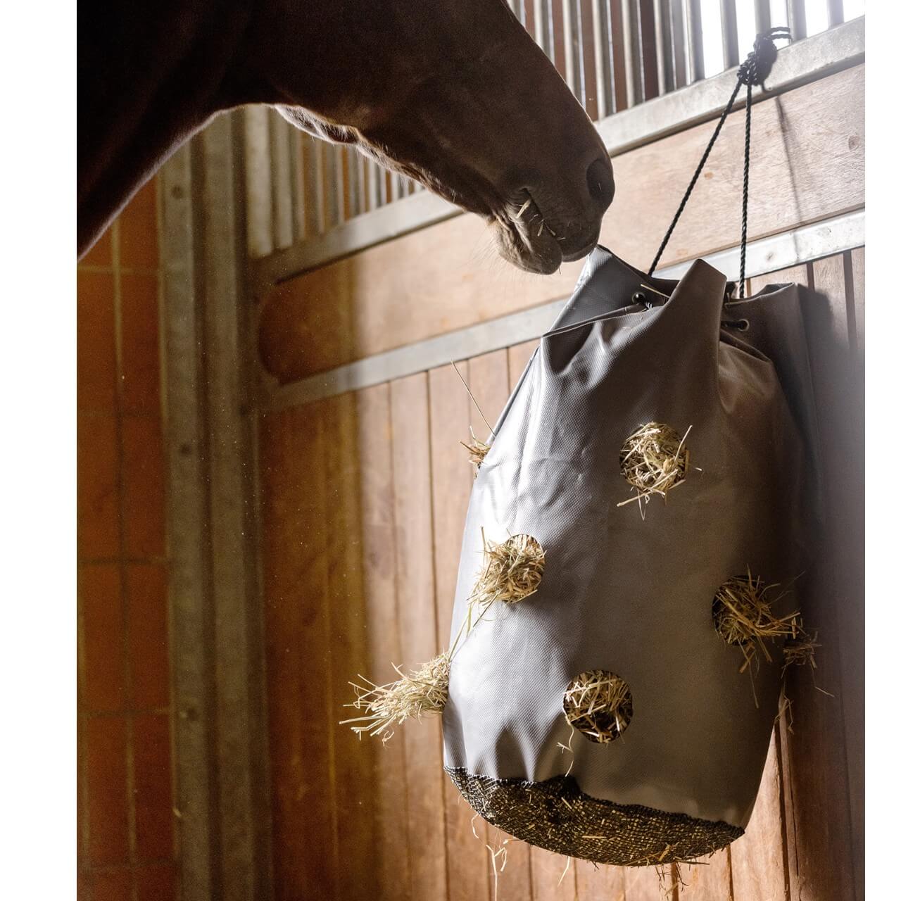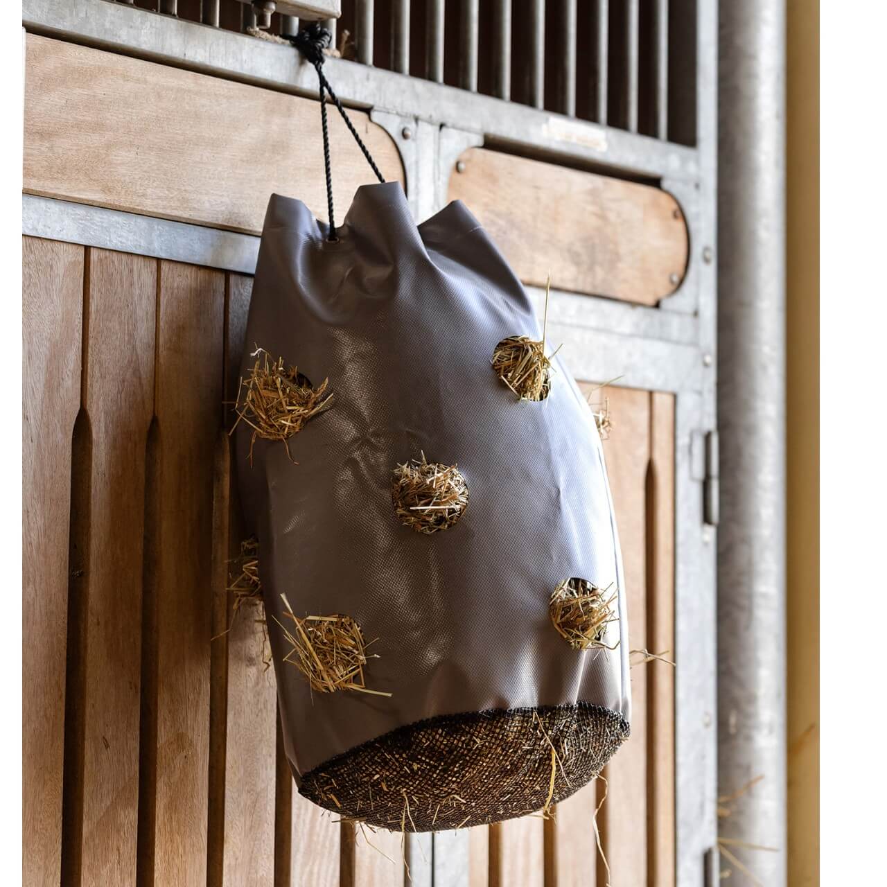 Der Heusack besticht durch sein zurückhaltendes, graues Design, das sich harmonisch in jede Stallumgebung einfügt. Die 12 Fressöffnungen mit einem Durchmesser von 8 cm sind optimal verteilt und fördern eine gleichmäßige Futteraufnahme. Die glatte Materialoberfläche schützt dein Pferd vor Verletzungen und sorgt für eine komfortable Nutzung.
