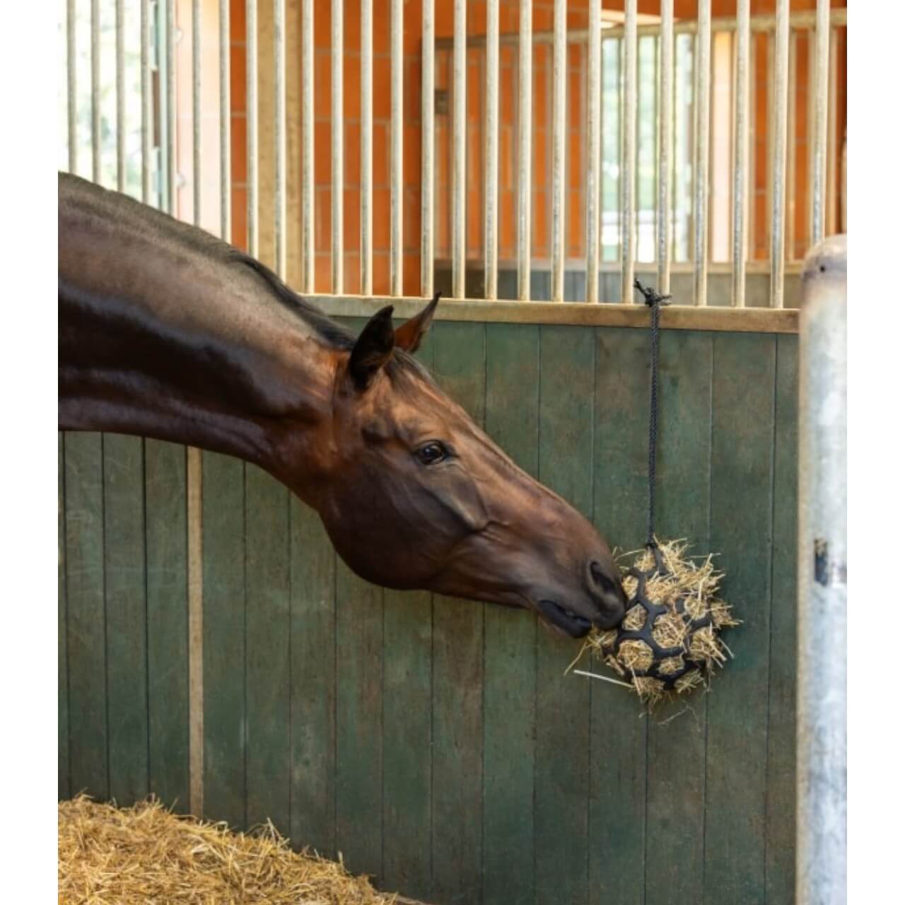 Der Heuball Flex wurde speziell für die Beschäftigung von Pferden entwickelt, sollte jedoch nicht unbeaufsichtigt verwendet werden. Pferde könnten sich im Material verbeißen oder sich anderweitig verletzen. Achte darauf, dass der Ball sicher angebracht ist und überprüfe ihn regelmäßig auf Schäden.