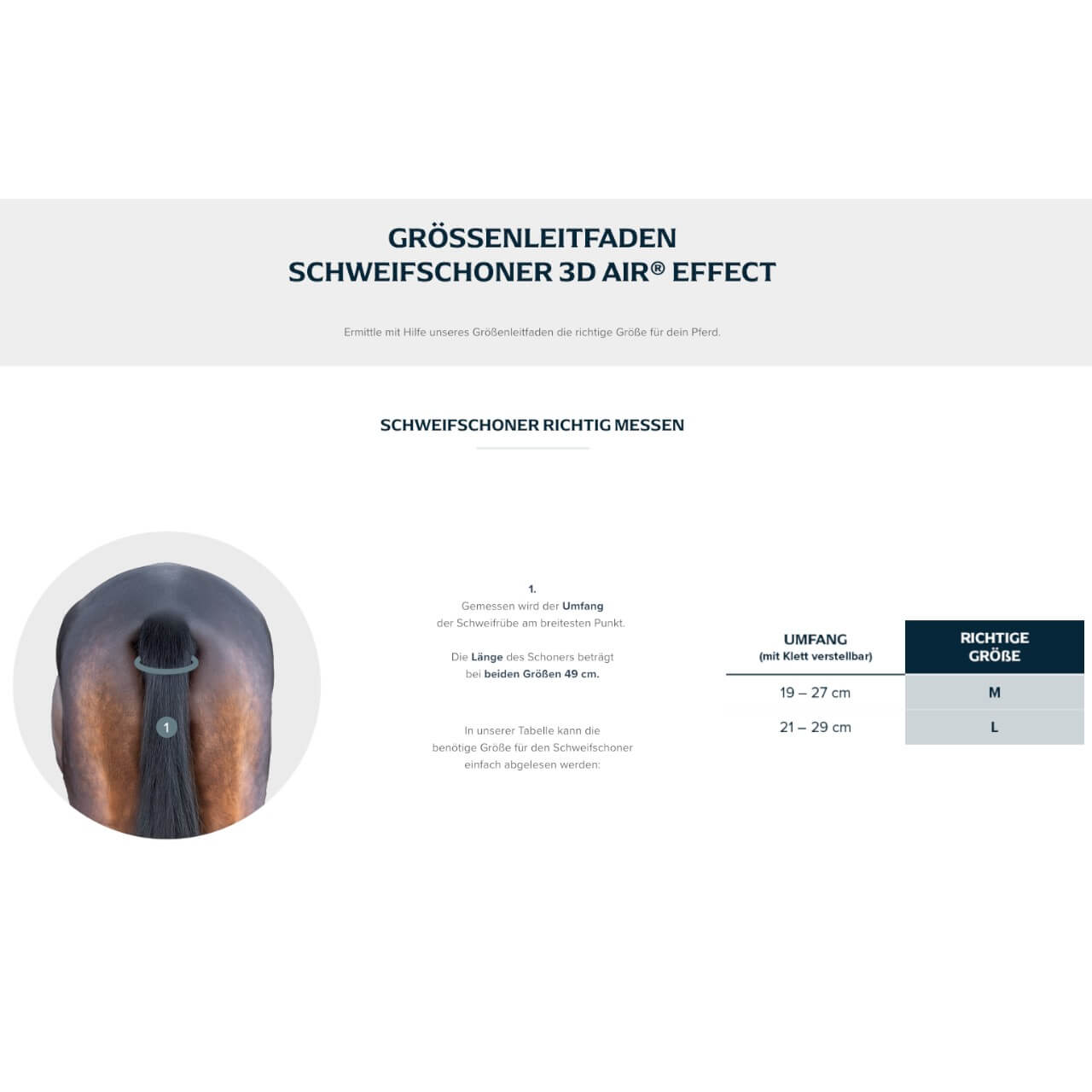 | Größe | L: geeignet für mittlere bis volle Schweifdicke, M: geeignet für dünne bis mittlere Schweifdicke |