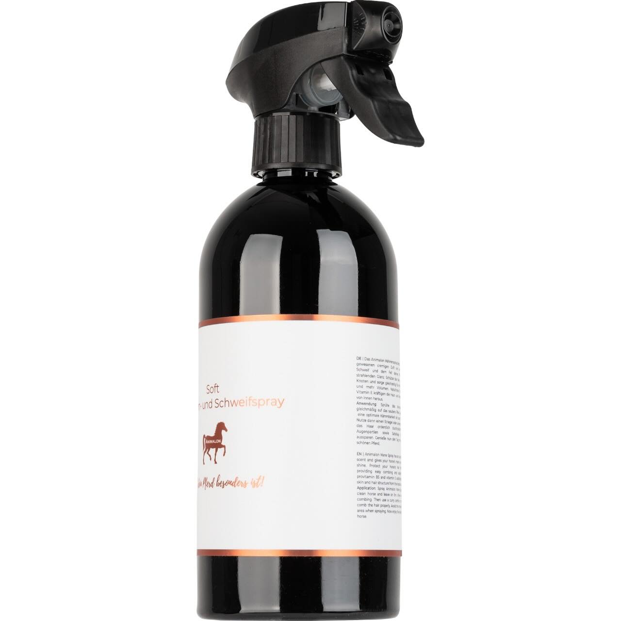 Das Soft Mähnen- und Schweifspray von Animalon kommt in einer praktischen 500 ml Sprühflasche. Die spezielle Formulierung sorgt für eine einfache Anwendung und gleichmäßige Verteilung. Die Inhaltsstoffe sind auf die spezifischen Bedürfnisse von Pferden abgestimmt, um die Pflege zu erleichtern.