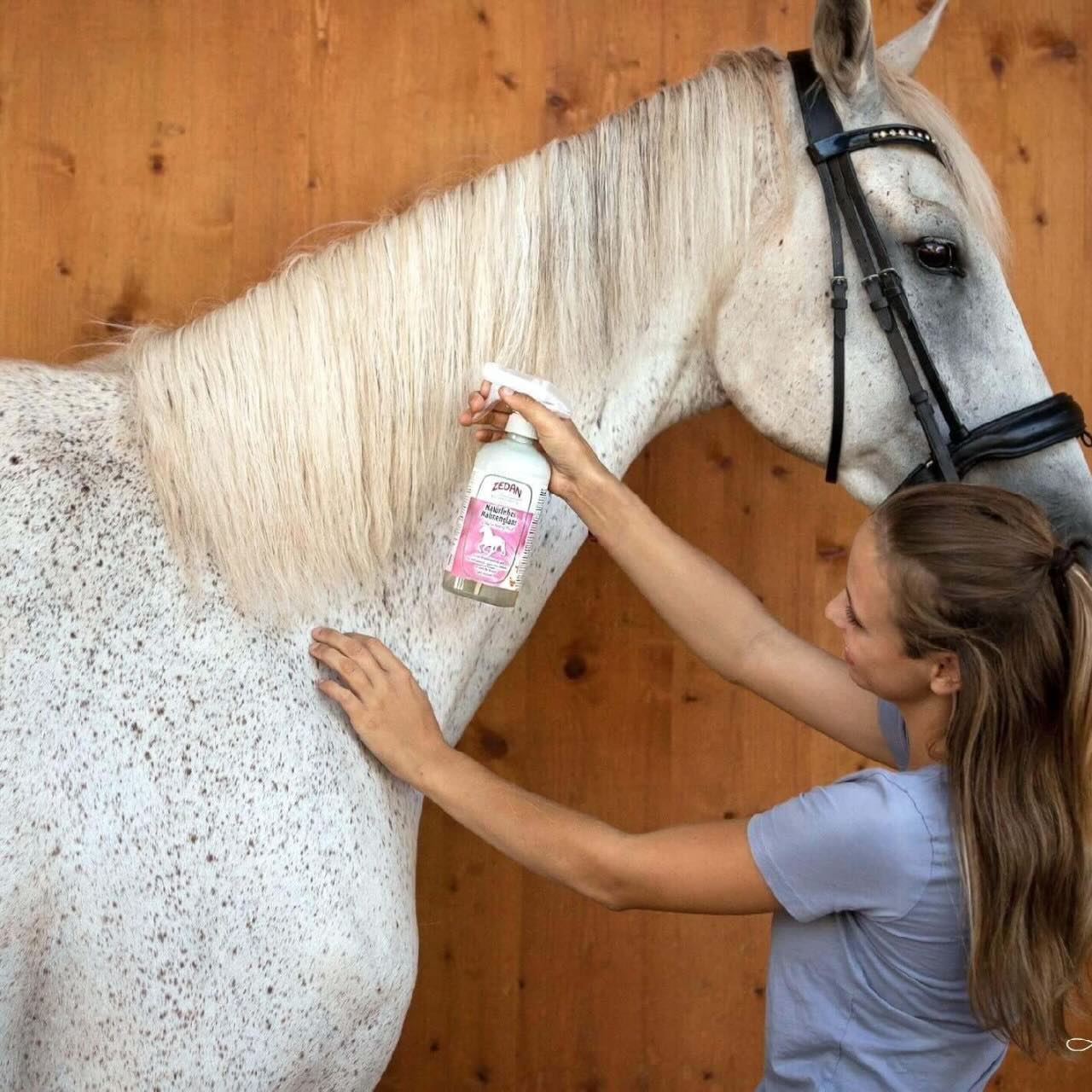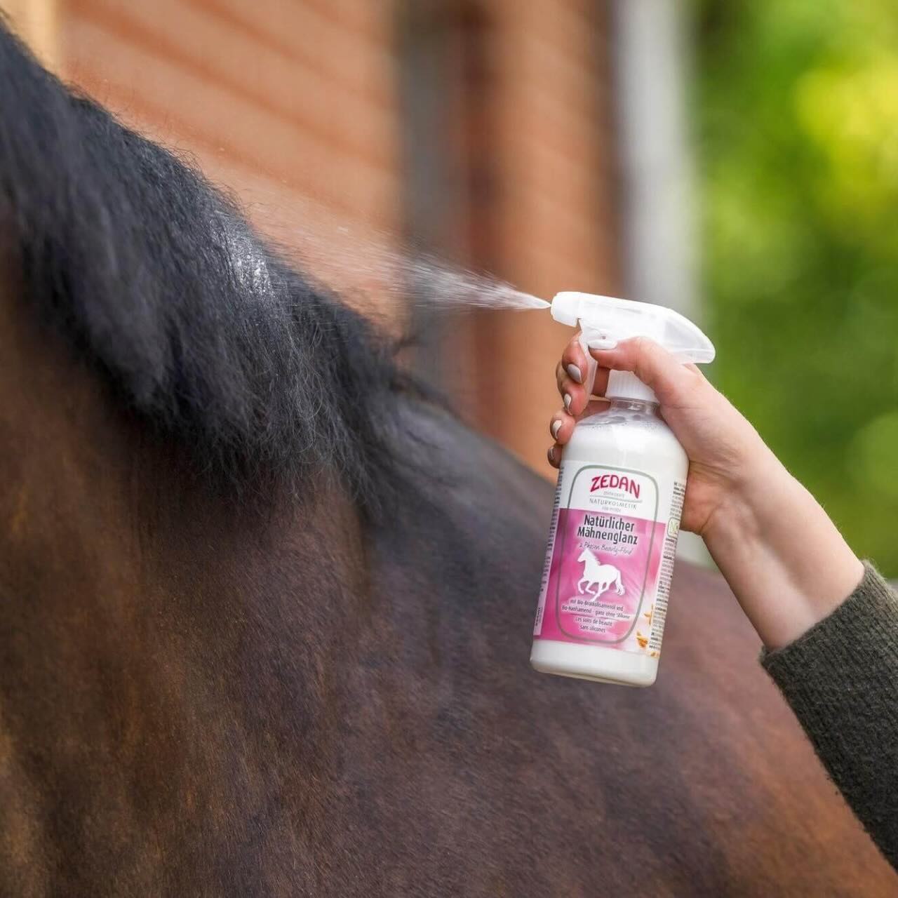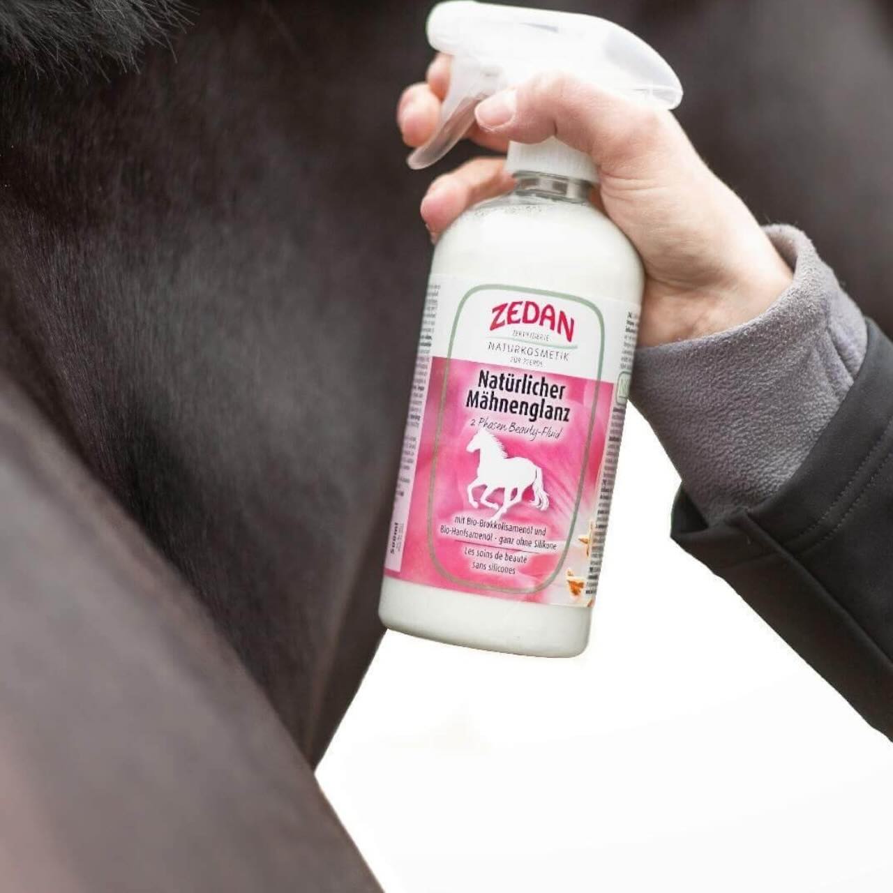 ZEDAN Mähnenspray Natürlicher Mähnenglanz sorgt für seidigen Glanz, leichte Kämmbarkeit und gesundes Haarwachstum – ganz ohne Silikone. Das innovative 2-Phasen-Fluid mit natürlichen Ölen pflegt Mähne und Schweif sichtbar, verbessert die Haarstruktur und hinterlässt einen geschmeidigen, gepflegten Look.
