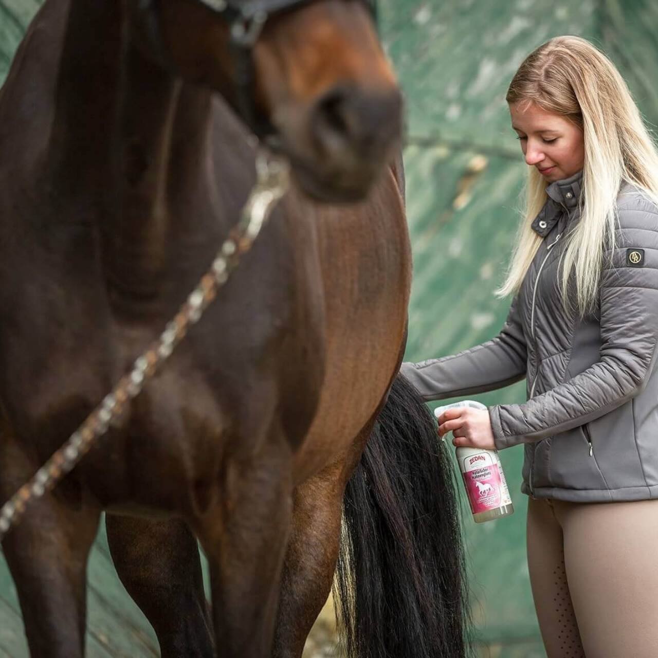 Vor der Anwendung kräftig schütteln, damit sich die zwei Phasen optimal verbinden. Anschließend auf Mähne und Schweif sprühen, leicht durchkämmen und an der Luft trocknen lassen. Bei Bedarf kann das Haar zuvor mit dem ZEDAN Bio-Ginkgo Shampoo gereinigt werden. Nach dem Trocknen wird das Haar geschmeidig, glänzend und leicht zu flechten – perfekt für den täglichen Einsatz im Stall oder auf dem Turnier.